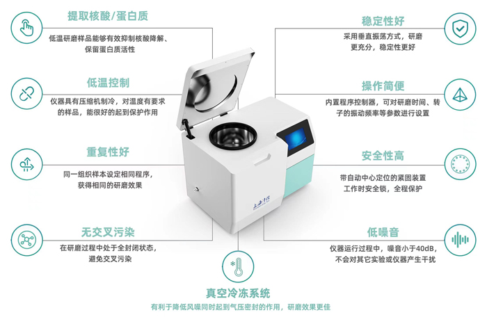 1、提取核酸/蛋白质 :低温研磨样品能够有效抑制核酸降解、保留蛋白质活性;